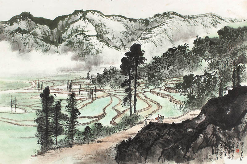 款识:峻岭松崖下银龙,奔流灌溉岁年丰。何须邀赏酬功绩,但愿造福寰宇中。黄纯尧写于成都。