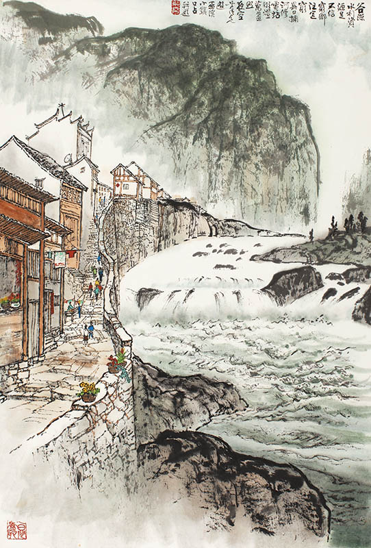 款识:谷深水利资源足,不信穷乡注定穷。异日拦河修电站,明灯万盏照夜空。黄纯尧游巫溪小镇口占并题。