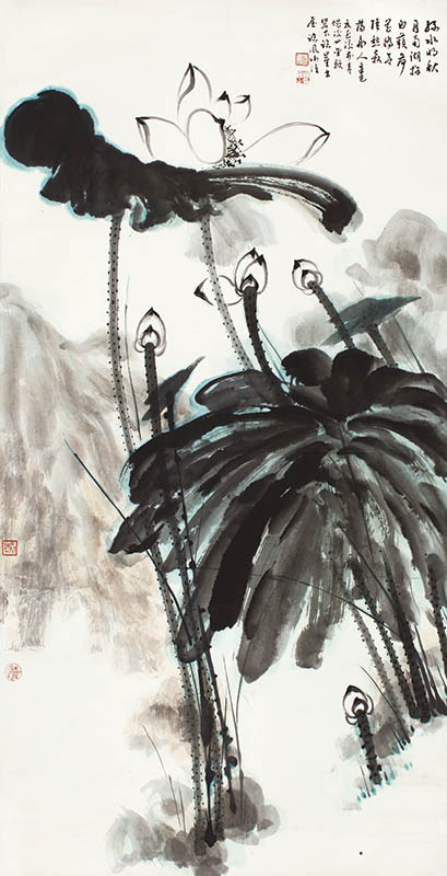 款识:渌水明秋月,南湖采白苹。荷花娇欲语,愁杀荡舟人。辛巳夏至后于青城后山金鞭岩下临岩书屋,临风谢渔。