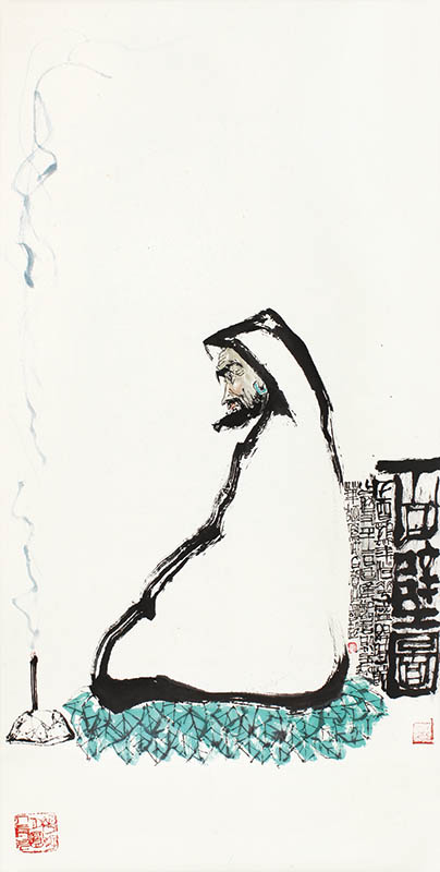 款识:面壁图。乙酉鸡年荷花盛开时节公历七月十二日适逢郑君照义华诞,写此以贺之。国超。