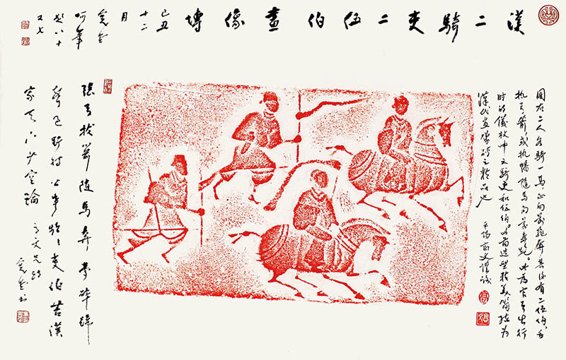 款识:汉二骑吏二伍伯画像砖。己丑十二月宽堂呵笔题八十又七。张弓拔箭随马奔,梦碎蹄声过野村。公事频频吏伯苦,汉家天下少空论。高文兄诗,宽堂书。