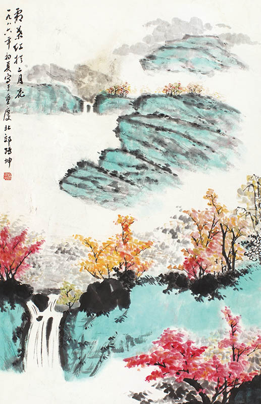 款识:霜叶红于二月花。一九八六年初夏写于重庆北郊,鸿坤。