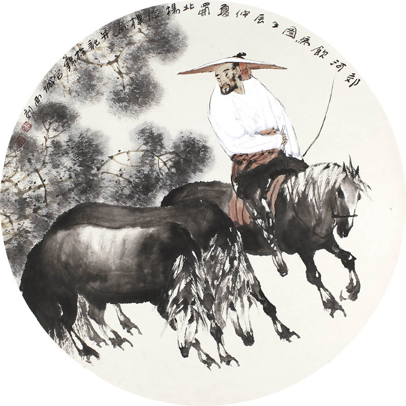 款识:郊河饮马图。壬辰仲夏蜀北杨俭朴画并记于锦官城西郊。