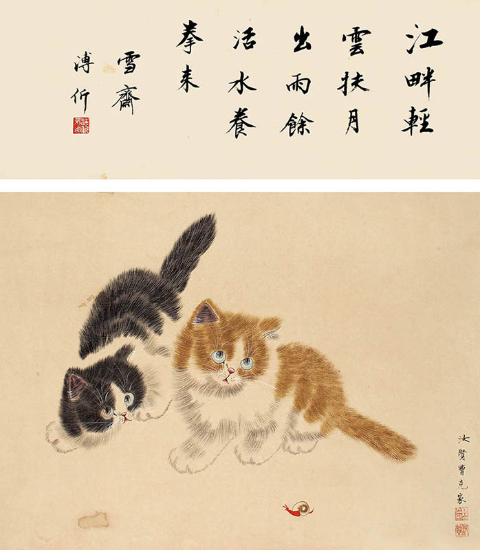 简介:曹克家(1906-1979):别名汝贤,北京人。擅长中国画,尤长工笔画猫。曾任中央工艺美术学院教师,轻工业部工艺美术公司干部,为中国美术家协会会员。爱新觉罗·溥伒(1893-1966):字雪斋、学斋,号松风主人。是道光帝的直系后人,近代书画家,与两个弟弟溥佺、溥佐均以画名,有“一门三杰”之称。其山水、花鸟、人物、鞍马均具风采,兼善画兰,风神飘逸,在画坛上堪称一绝。