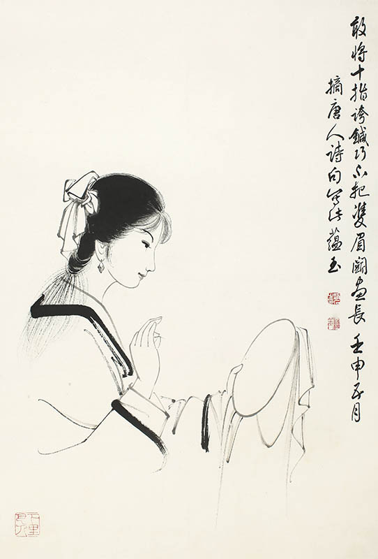 款识:敢将十指誇鍼巧,不把双眉斗画长。壬申五月摘唐人诗名写此蕴玉。