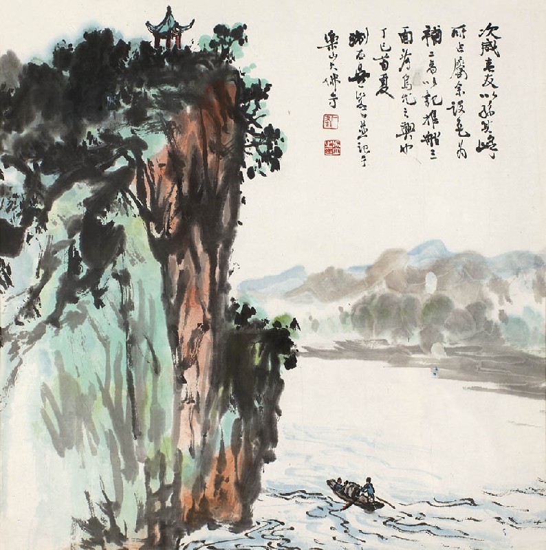 款识:次威老友以孙其峰所作嘱余设色为补二者,以记推船三面看乌尤之兴也。丁巳首夏,淛西吴一峰并记于乐山大佛寺。