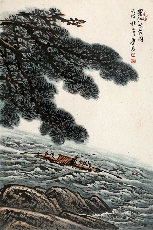 款识:蜀江放筏图。丙戌秋七月,学恭。