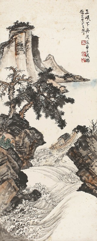 款识:三峡下舟。戊辰画于成都,赵完璧别名樵子。