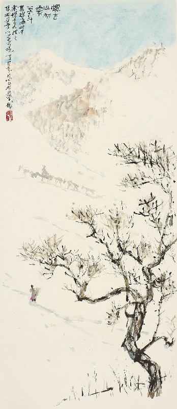 款识:螺吉山初霁。一九七七年写拔海四千米螺吉山摆摆顶所见雪山之奇观,丁巳冬月写于蓉城。