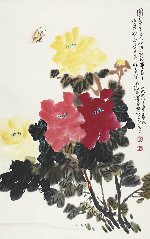 款识:国色之光,富丽堂皇。一九九八年岁次戊寅初夏于中崖归来写,道熙古城嘉州紫气堂。