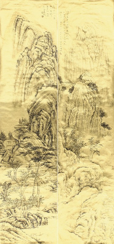 款识:1、小桥流水人家,癸巳年秋月蜀南红光于集贤画院。2、谁家亭子傍西湾,高树扶疏出石间。落叶尽随溪雨去,只留秋色满空山。黄公望诗,癸巳之冬丁红光写。