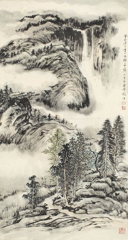 款识:登山探古寺,一路听泉鸣。乙亥冬,国屏龙治。