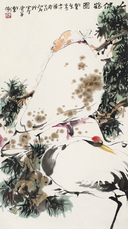 款识:伴鹤图。戴京大哥六十禧寿,甲戌初春于风骨堂中,戴卫。