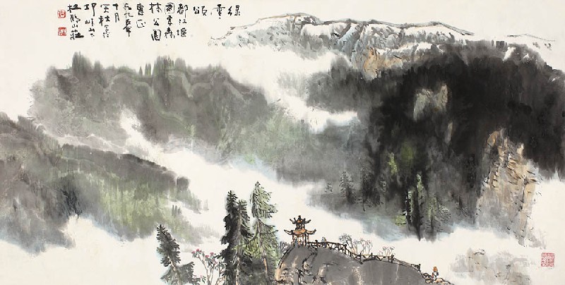 款识:绿云颂。都江堰国家森林公园惠正,一九九五年十月笑秋写于邛崃山下杜鹃庄。