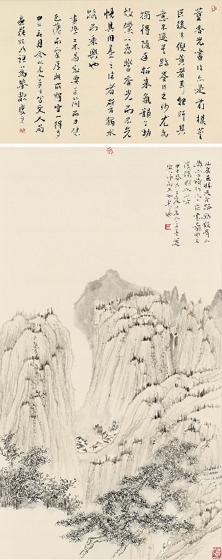 款识:山居直接天台路,无数青山与云树。行人已在画图中,又复携图入山去。甲午春六言山人以元人笔墨运宋人布局,不知其可也。