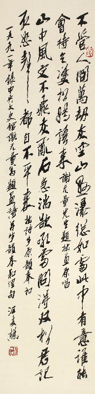备注:不管人间万劫灰,空山叠瀑总如雷。此中有意谁能会,待乞双松转语来。---谢无量先生题拙画原唱。山中风定不飞灰,乱石急湍欲吼雷。问得双松君记取,怒声都自不平来。---拙诗步原韵奉和