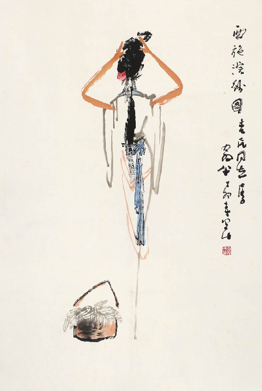 款识:西施浣纱图。吉民同志嘱,九躬八十,丁卯春写此。