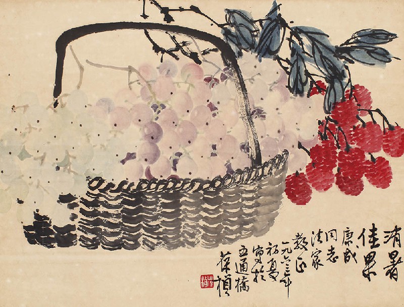 备注:1、罕见的果篮、彩葡萄、红荔枝俱全的苏葆桢六十年代精品作;2、原装旧裱;3、著名画家何康成上款。