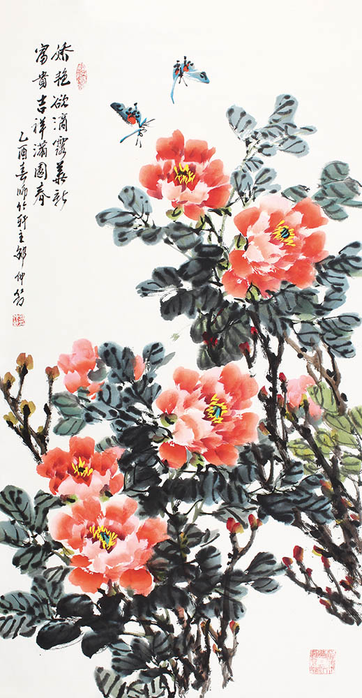 款识:娇艳欲滴露华新,富贵吉祥满园春。乙酉春师竹轩主邵仲节。