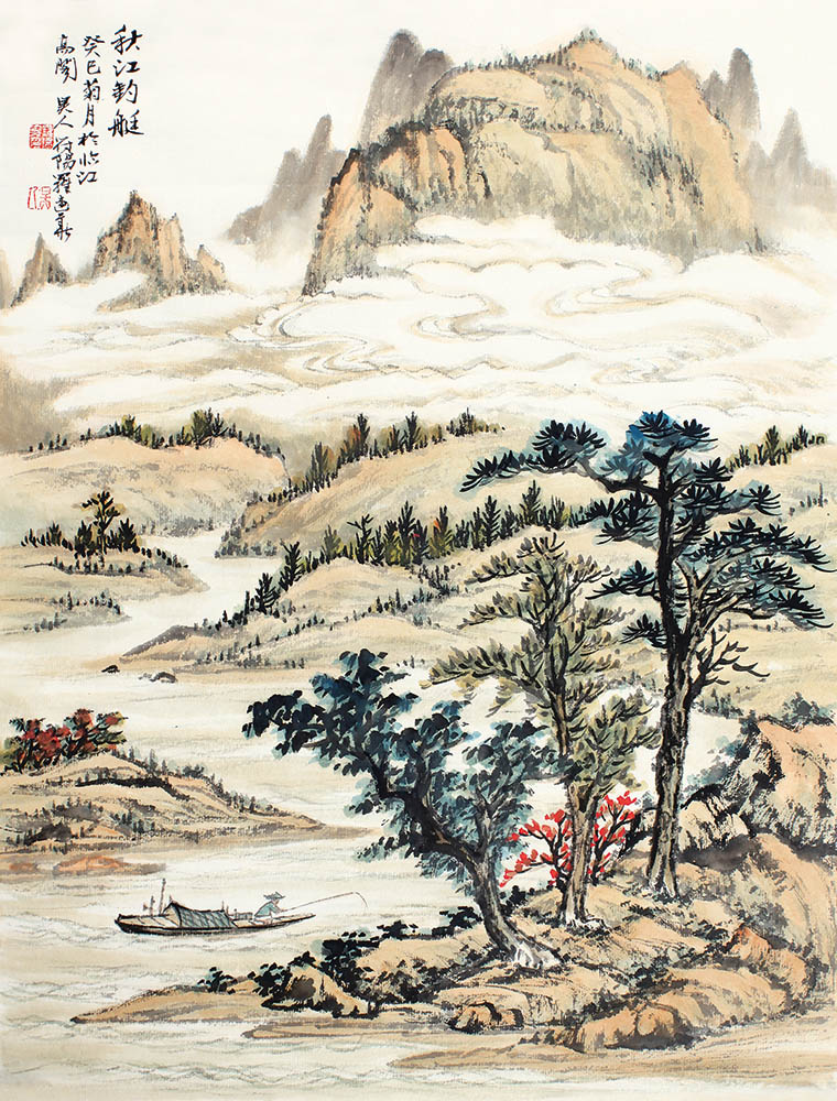 款识:秋江钓艇。癸巳菊月于临江高阁,昊人符阳罗远华。