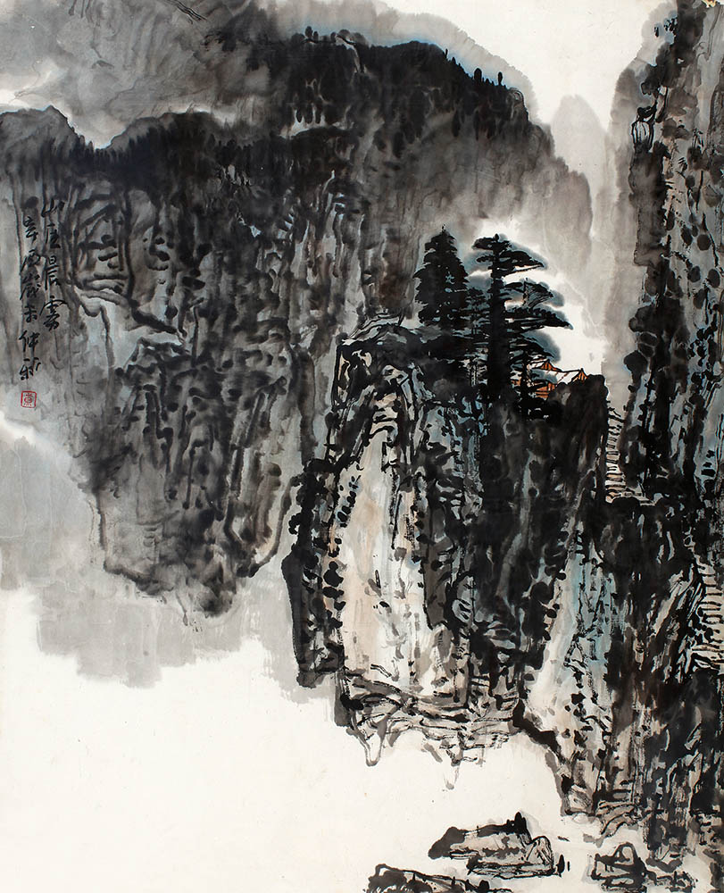 款识:山区晨雾。辛酉岁末,仲新。