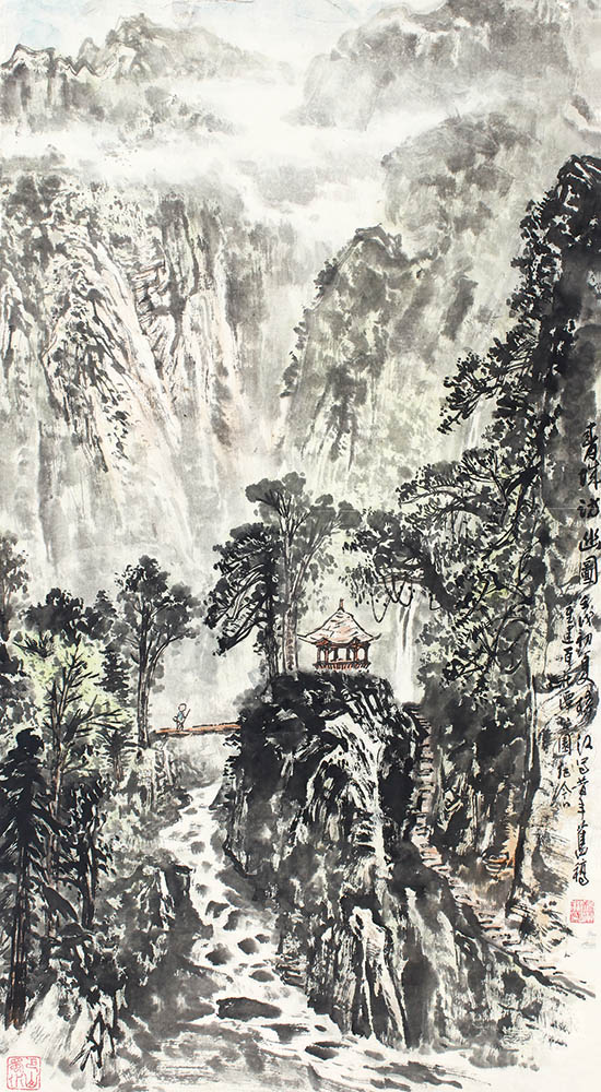款识:青城访幽图。重建百花潭公园纪念,壬戌初夏梓江写昔年旧稿。
