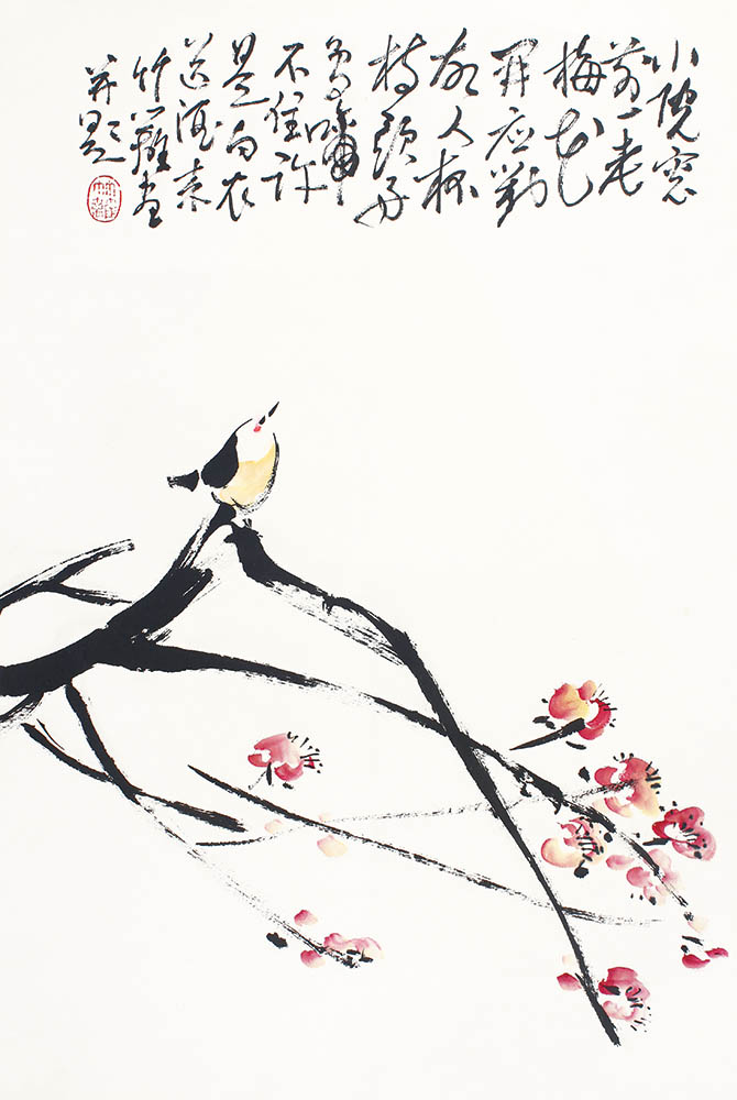 款识:小院窗前一老梅,花开应对故人杯。枝头好鸟啼不住,许是白衣送酒来。竹篱画并题。