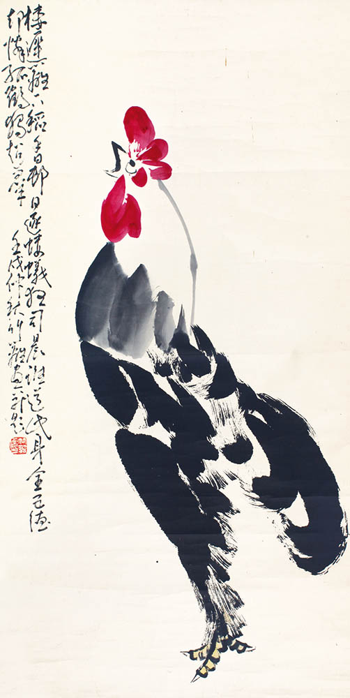 款识:栖迟篱下稻香邨,日逐蝼蚁夜司晨。谁道此身全五德,却怜孤鹤独超群。壬戌仲秋竹篱画并题。