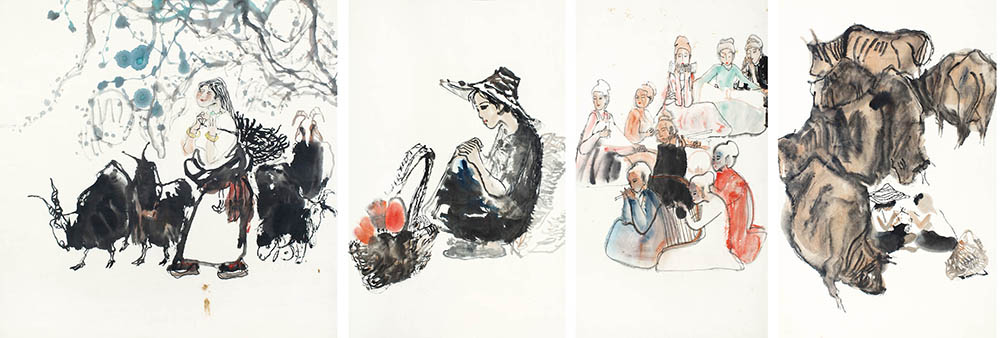 款识:1、证明:“牧羊图”和“宫乐图”为彭先诚先生习作,作于一九八三年东城区文化馆,是彭先诚真迹。证明人:赵新亚。2014、元26。2、牧趣图和採蘑图为彭先诚习作,一九八三年本人得至于成都青石桥原东城区文化馆并收藏至今。范家成。二〇一三年七月廿一日。