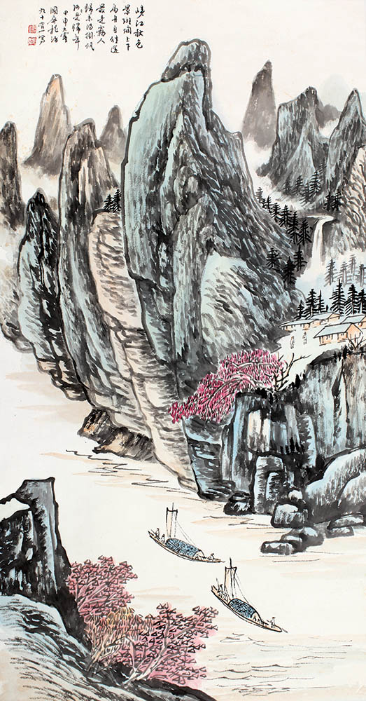 款识:峡江秋色景斑斓,上下扁舟自往还。最是羁人归未得,挂帆何日是归年。甲申大寒,国屏龙治九十有一写。