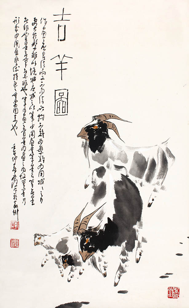 款识:吉羊图。作画应有法而又不为法,结构不难为繁难为用减。减之力更大于繁,非以境减,应减之以笔。中国画重笔墨,有笔无墨者非也,有墨无笔者亦非也。笔为画之骨,墨为画之肉,故笔墨乃形成中国画艺术特色之重要因素也。壬午仲春道熙写于嘉州。