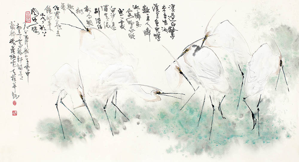 款识:溪边白鹭。来吾告汝。溪里鱼儿堪数。主人怜汝汝怜鱼,要物我、欣然一处。白沙远浦。青泥别渚。剩有虾跳鳅舞。任君飞去饱时来,看头上、风吹一缕。一九八〇年岁在庚申初冬写稼轩词意于成都槐荫陋室,天柱并记。