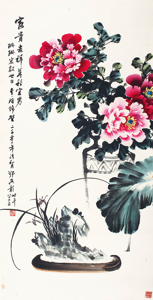 款识:富贵吉祥,草种宜男。玬琳宏毅世台饰壁,二千零一年清和月邓奂彰时年八十又五。