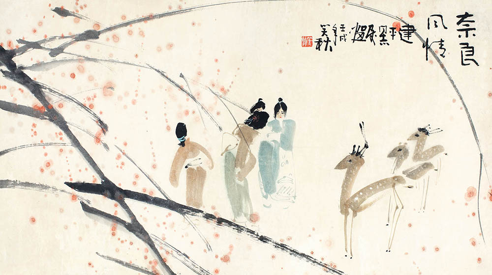 款识:奈良风情。建平同志嘱画,壬戌年笑秋。