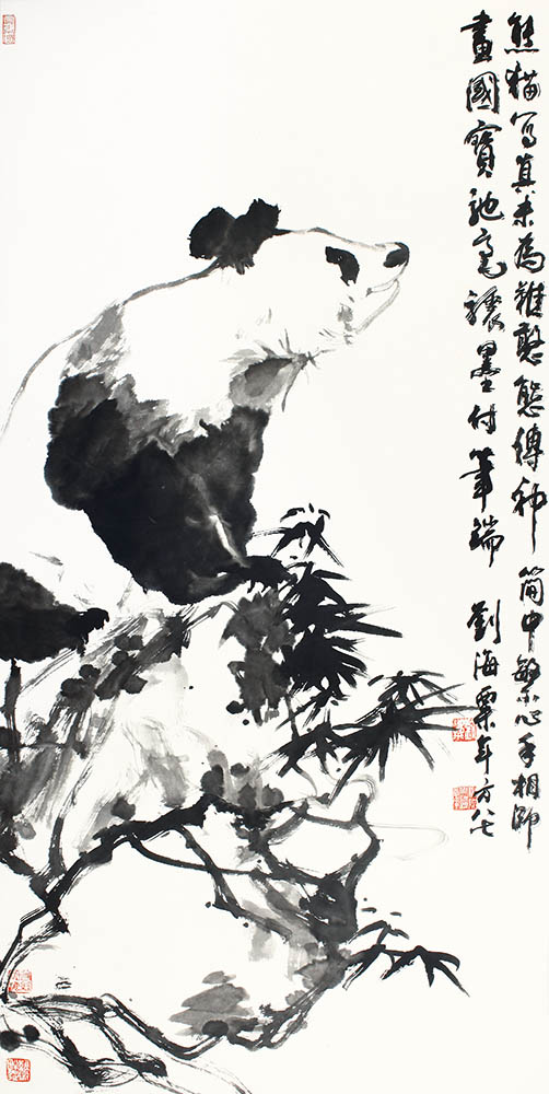款识:熊猫写真未为难,憨态传神简中繁。心手相师画国宝,驰毫骤墨付笔端。刘海粟年方八七。