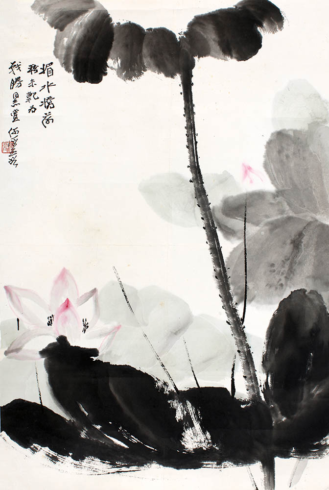 款识:媚水娇荷粉未干。为战胜同志赏,何海霞。