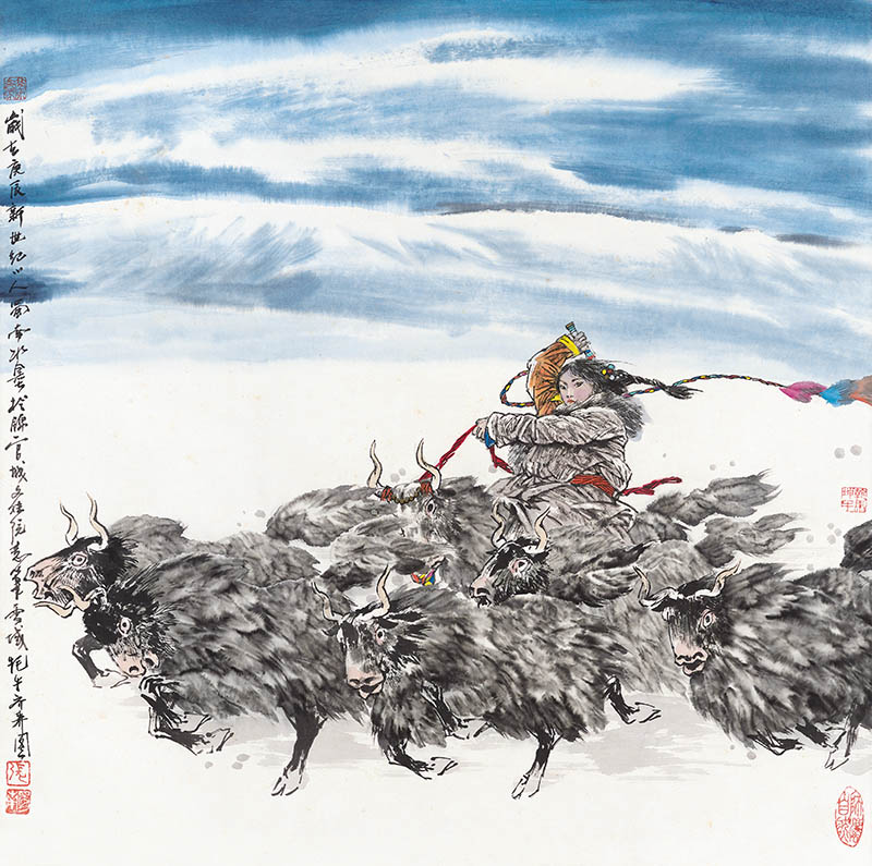 款识:岁在庚辰新世纪之人蜀南水墨于锦官城文殊院意笔雪城牦牛齐奔图