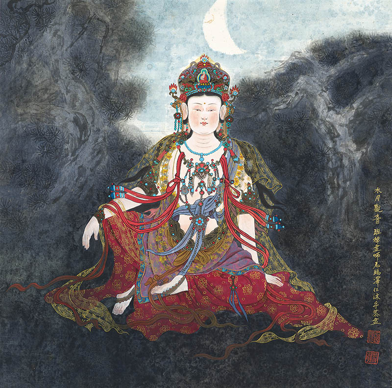 款识:水月观音 班禅画师尼玛泽仁沐手恭画