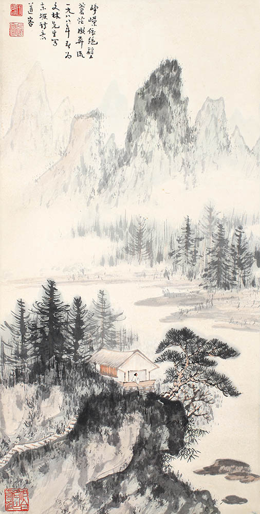 款识:峥嵘依绝壁,苍茫瞰奔流。一九八八年春为文林先生写东坡诗意,道容。