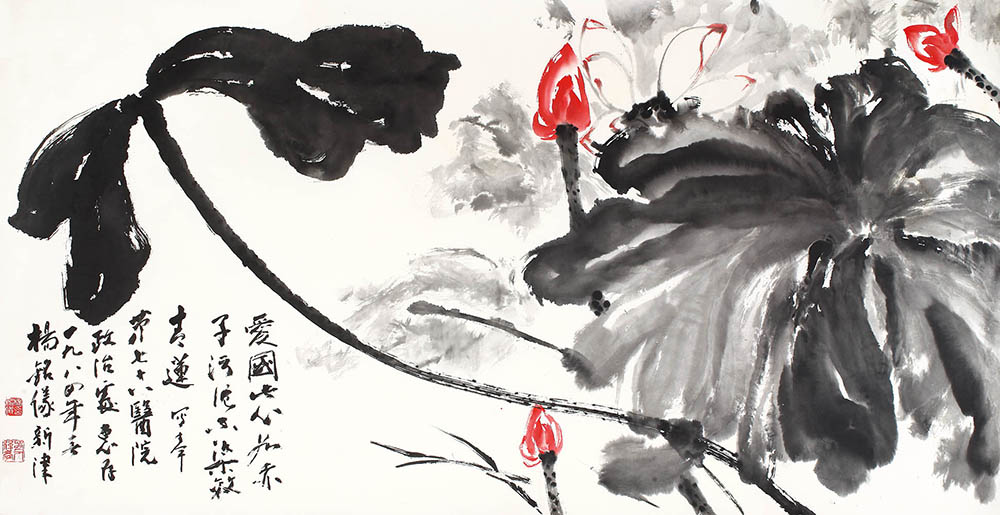 款识:爱国此心如赤子,污泥不染效清莲。写奉第七十八医院政治处惠存,一九八四年春,杨铭仪新津。