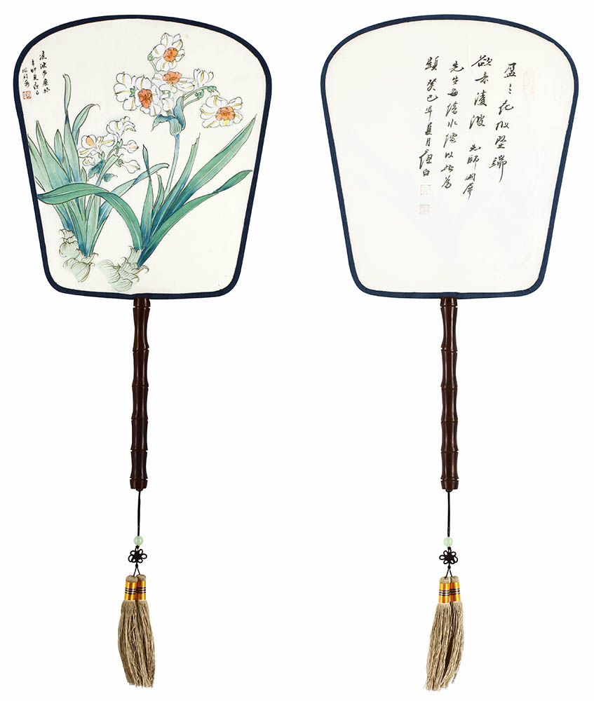 款识:正面:凌波步尘袜,辛卯夏夜白作于蜀;背面:盈盈花似坠,端欲去凌波。先师国屏先生每绘水仙以此为题。癸巳年夏月,夜白。