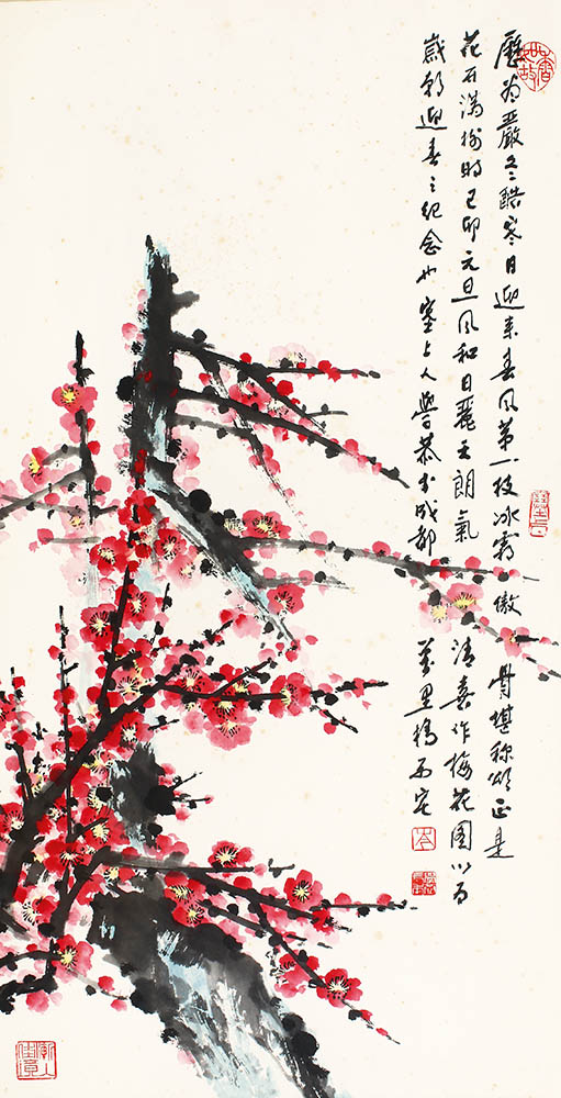 款识:历为严冬酷寒日,迎来春风第一枝。冰霜傲骨堪称颂,正是花开满树时。己卯元旦风和日丽,天朗气清。喜作梅花图以为岁朝迎春之纪念也。塞上人学恭于成都万里桥西宅。