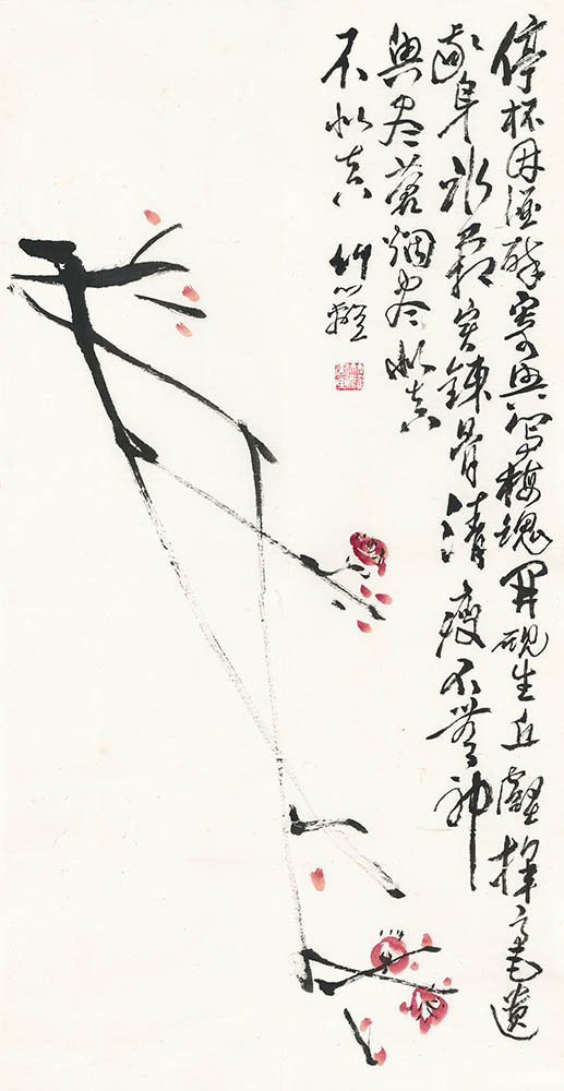 款识:停杯因酒醉,寄兴写梅魂。开砚生丘壑,挥毫遗我身。冰霜实炼骨,清瘦不无神。兴尽苍烟尽,似春不似春。竹篱。