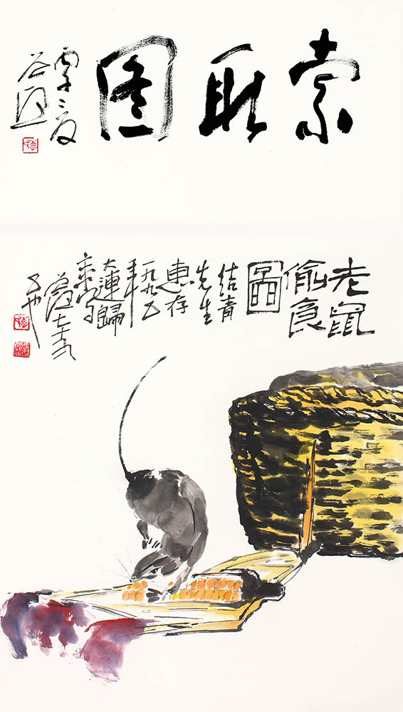 款识:本作:老鼠偷食图。结青先生惠存,一九九五年大连归来写,道熙七十又五也。诗堂:丙子之夏道熙。