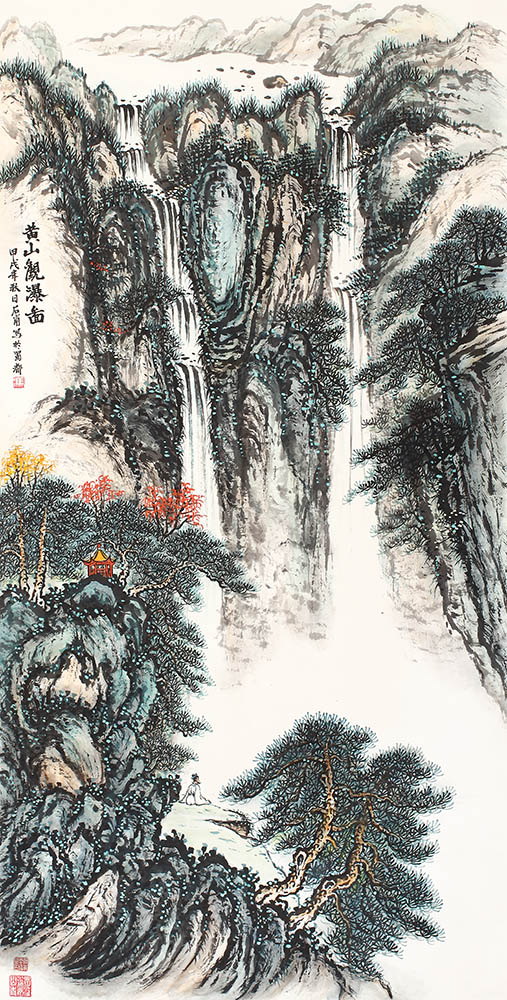 款识:黄山观瀑图。甲戌年秋日石甫写于蜀都。