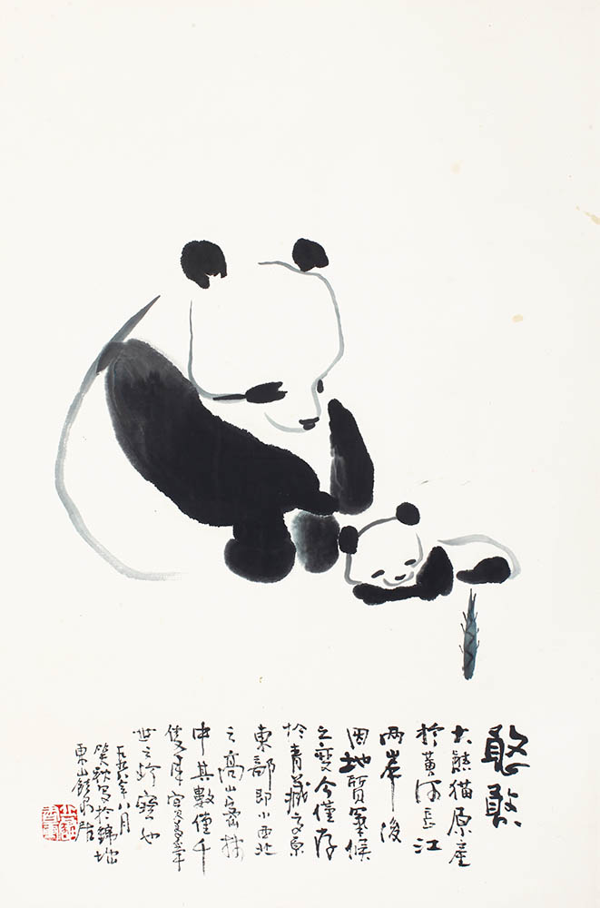 款识:憨憨。大熊猫原产于黄河长江两岸,后因地质气候之变,今仅存于青藏高原东部,即小西北之高山密林中,其数仅千只耳,实为稀世之珍宝也。一九九八年八月笑秋写于锦城东山饮泉居。