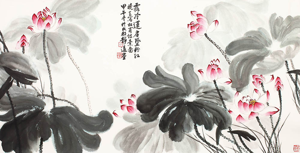 款识:露冷莲房坠粉红。晓音写杜甫诗意图,甲午冬于成都静远堂。