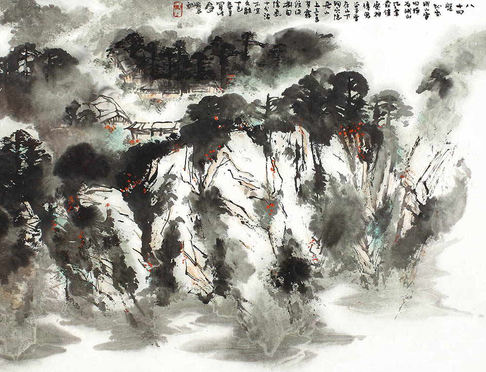 款识:八十四盘地处涐山雷洞坪,为峨山风景最佳处。相传鬼谷子曾在山下洞穴隐居,山上长年有雾缠绕树间,阴气十分浓,不宜久驻。丁巳春月写此,九躬题并记。
