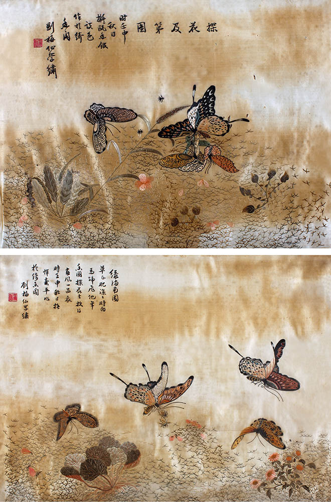 款识:1、探花及第图。时壬申秋日拟瓯香馆设色作于绮香阁,刘梅仙学绣。2、绿满南园草正肥,深深时向马蹄飞。他年香国採花去,披得春风一品衣。时壬申秋日抚恽寿平作于绮香阁,刘梅仙学绣。